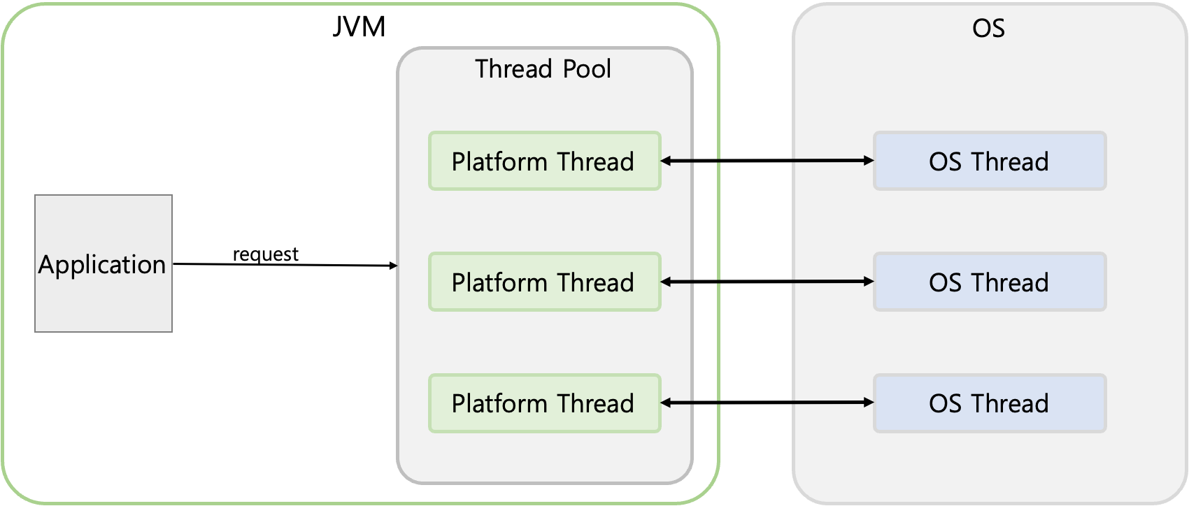 기존 방식의 스레드는 Platform Thread와 OS Thread를 1대 1로 매핑한 형태이다. Java 애플리케이션에서 스레드를 사용하면 OS 영역의 스레드를 사용하는 것과 같다. 즉, OS 스레드를 생성하기 위해서는 시스템 호출을 수행해야 하는데, 이는 OS 커널에서 사용할 수 있는 스레드 개수가 제한적이고, 생성과 유지비용이 비싸다. 그렇기 때문에 필요에 따라 스레드를 재할당하거나 해제하는 대신 Thread Pool을 사용한다.