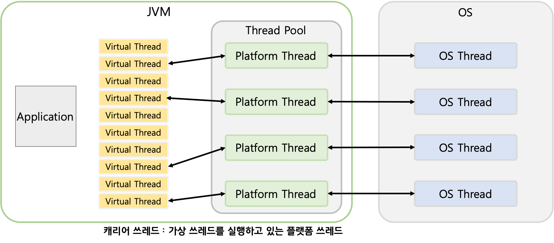 Virtual Thread는 기존 Java의 스레드 모델과 달리 Virtual Thread와 Platform Thread로 나뉜다. 하나의 Platform Thread는 n대 1로 여러 Virtual Thread를 번갈아가며 매핑되어 실행되는 구조이다. Virtual Thread는 JVM에서 관리되기 때문에 스레드 할당 시 시스템 호출이 필요하지 않고, OS 영역에서 컨텍스트 스위칭이 발생하지 않아 성능상 이점이 있다. 또한 IO 블로킹 발생 시 기존의 자바 스레드 구조는 대기상태로 이어졌다면, Virtual Thread 모델에서는 Carrier Thread가 다른 Virtual Thread로 전환하여 다음 작업을 진행하기에 대기 상태가 발생하지 않는다.