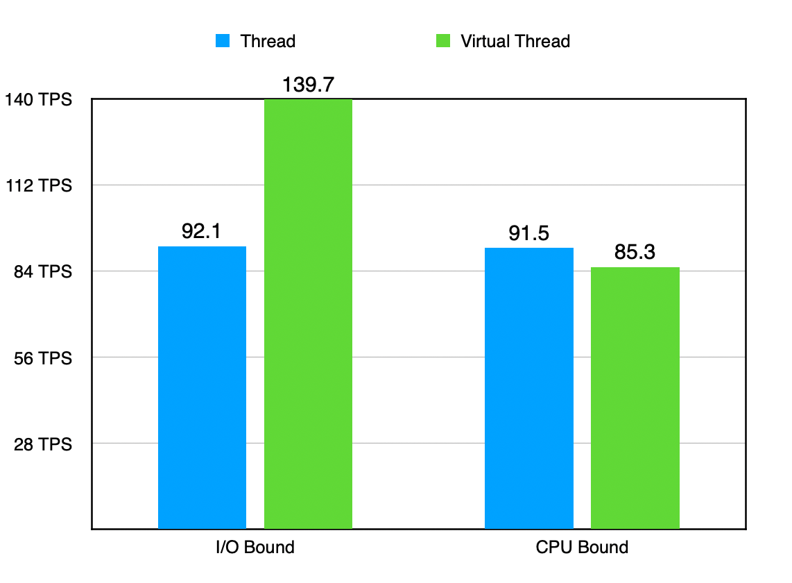 Project Loom의 일환으로 JDK21에서 release 된 Virtual Thread는 기존의 OS Thread와는 다르게 훨씬 더 적은 리소스를 소비한다. 기존 Java의 Thread는 OS Thread를 직접 사용하기에 수천 개 이상의 요청 처리 시 효율적이지 못했다. 그러나 경량 스레드 모델인 Virtual Thread의 등장으로 OS Thread를 그대로 사용하지 않고 JVM의 내부 스케줄링을 통해 다수의 스레드를 사용할 수 있게 하였다. 따라서 더 많은 요청처리가 가능해지고, 컨텍스트 스위칭 비용을 줄이며 성능을 높일 수 있었다.