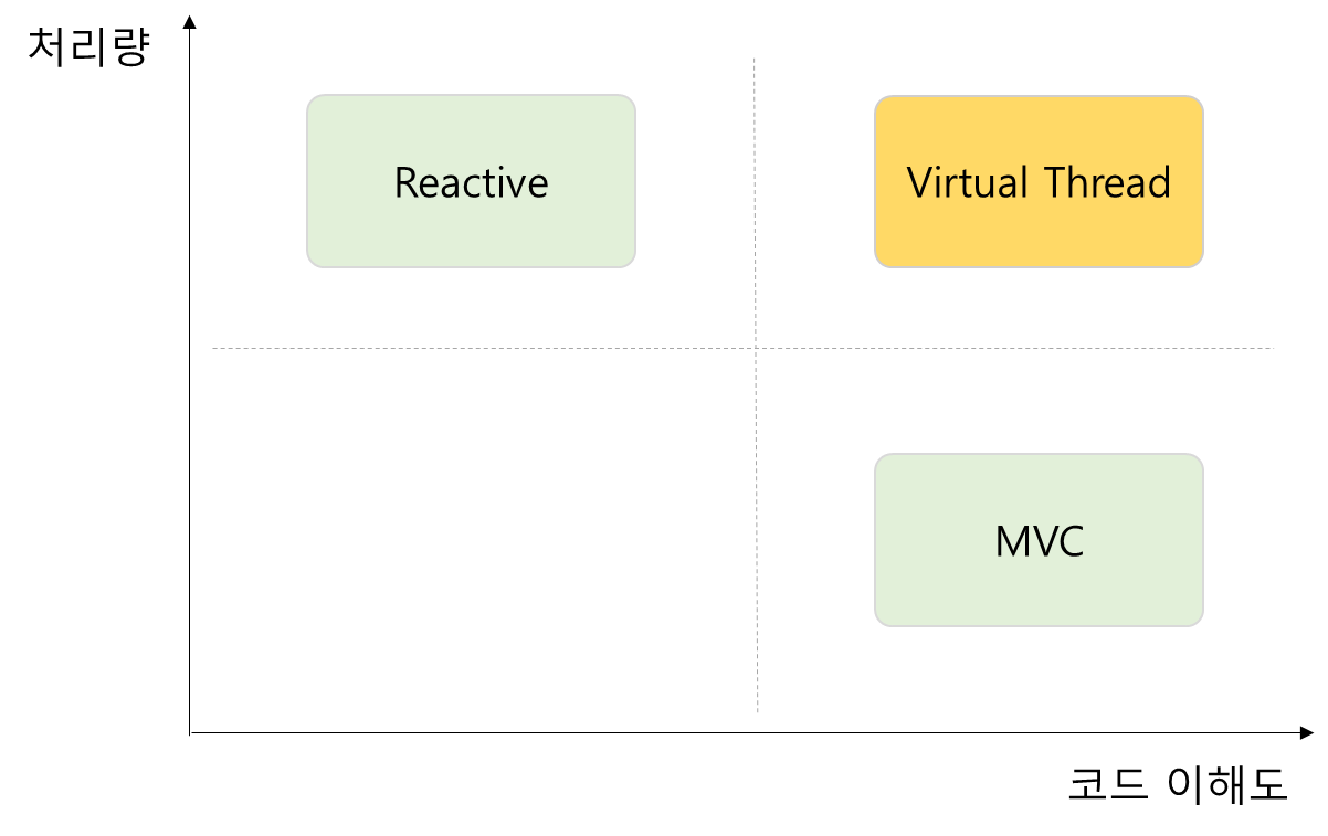 이전 방식이라면 높은 처리량을 보이기 위해 Reactive Programming이 대안이 될 수 있었다. 이제는 Virtual Thread를 통해 Non-blocking을 통한 효율적인 자원 사용이 가능해졌고, 가독성을 높이고, 기존의 스레드 모델에 그대로 적용이 가능하기 때문에 쉽게 사용할 수 있다.
