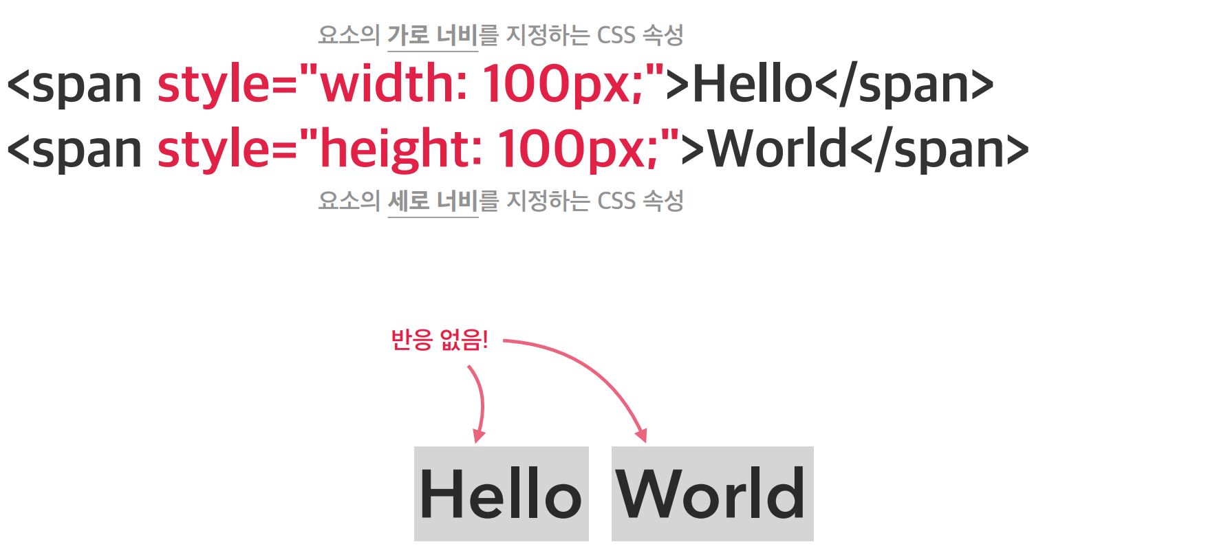 - 위처럼 span 태그에다가 스타일요소로 width와 height를 적용해도 화면에 보여지는 화면에는 반응이 없다는 것을 확인할 수 있습니다.