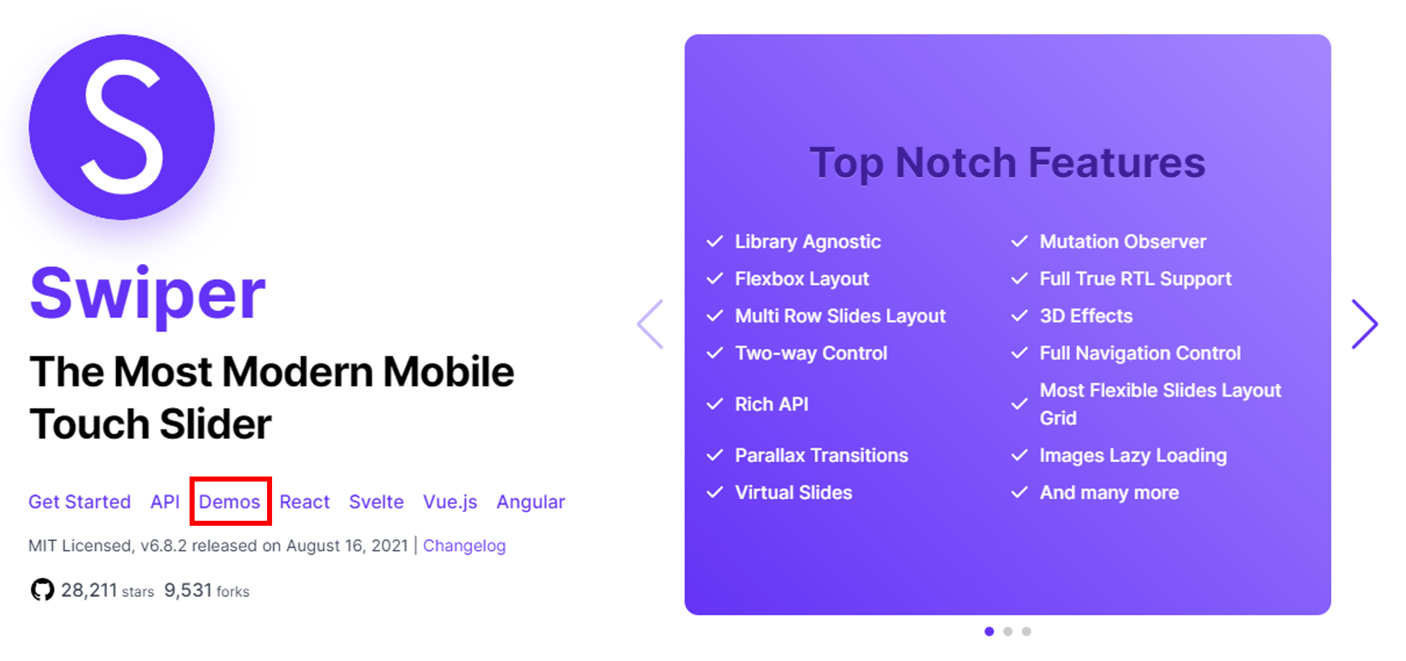 해당 사이트에서 Demos를 클릭해 들어가면 자신이 사용하고 싶은 슬라이드 방식을 찾아보실 수 있습니다.