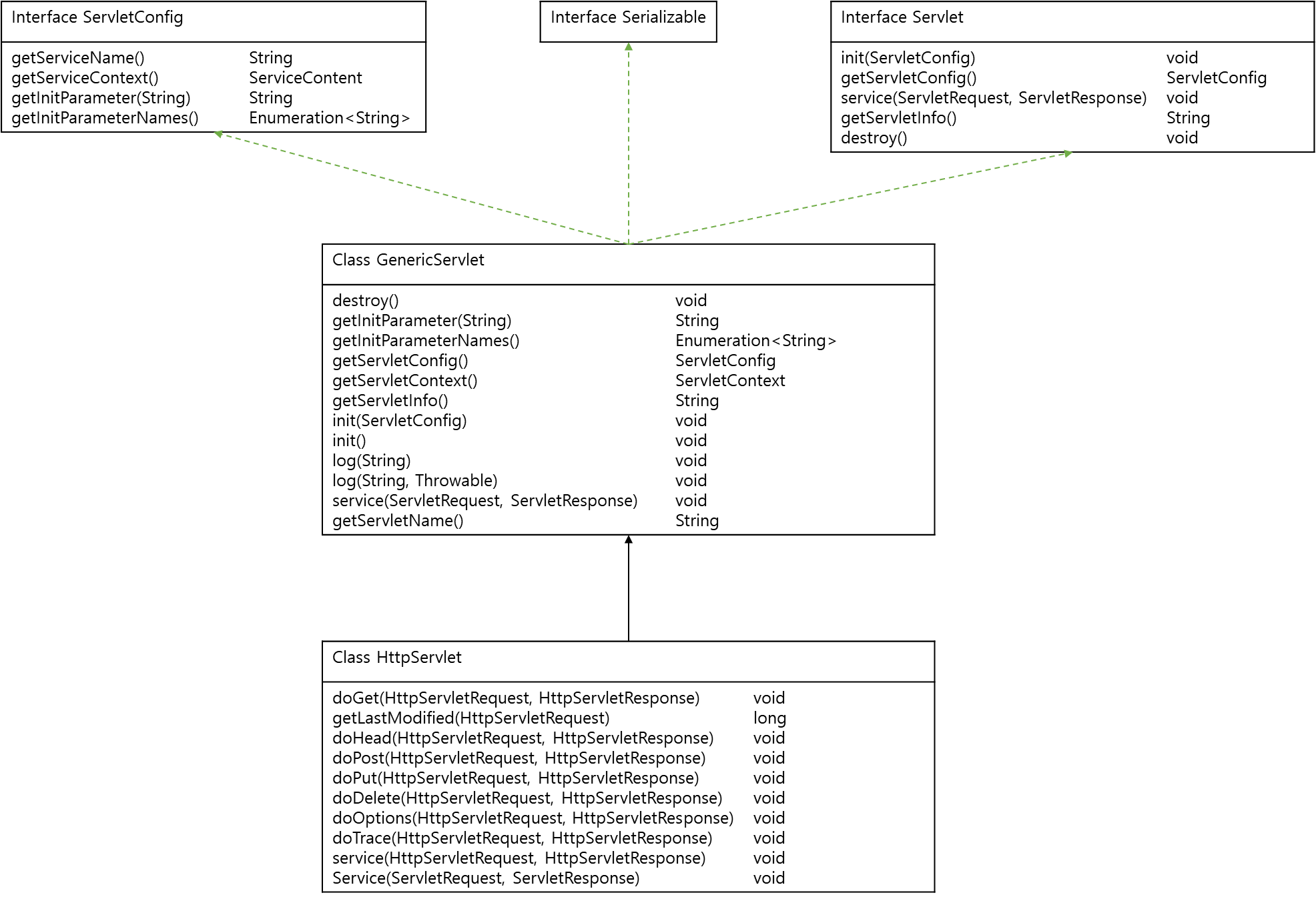 - GenericServlet은 Servlet 인터페이스의 init()과 destroy()를 제공하고, 사용자는 service()만 구현하면 된다.