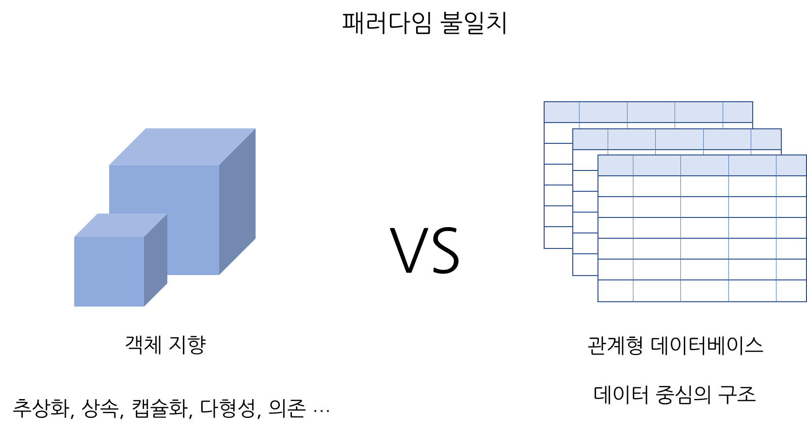 관계형 데이터베이스와 객체지향은 설계 원칙이 다르기 때문에 사용 방법과 표현방식에 차이가 있을 수 밖에 없다.