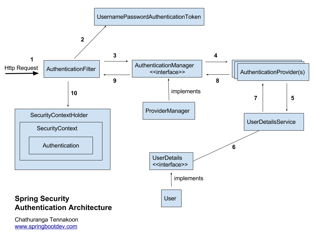 - AuthenticationFilter(ex. UsernamePasswordAuthenticationFilter)에서 AuthenticationManager에 의해 attemptAuthentication() 메서드 호출
